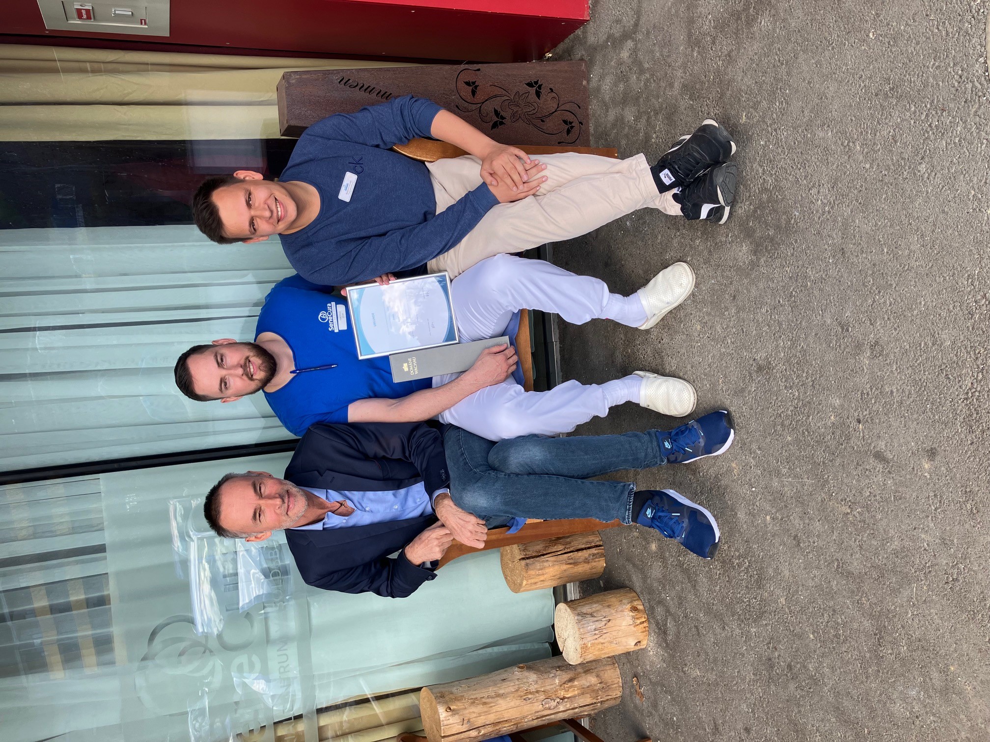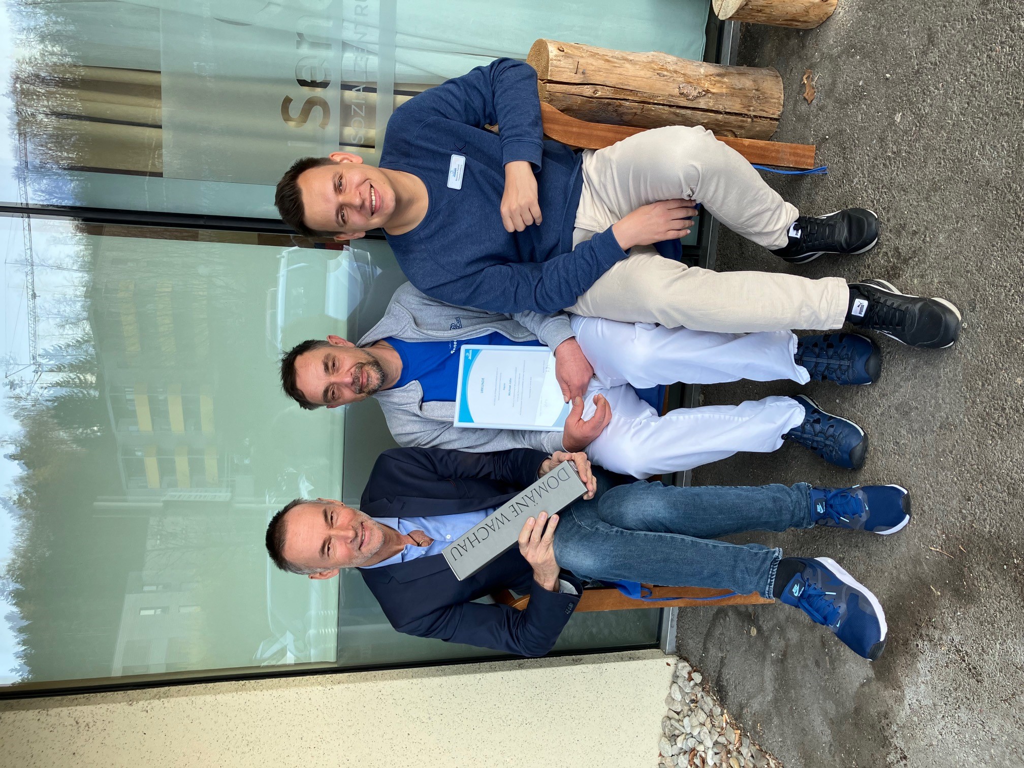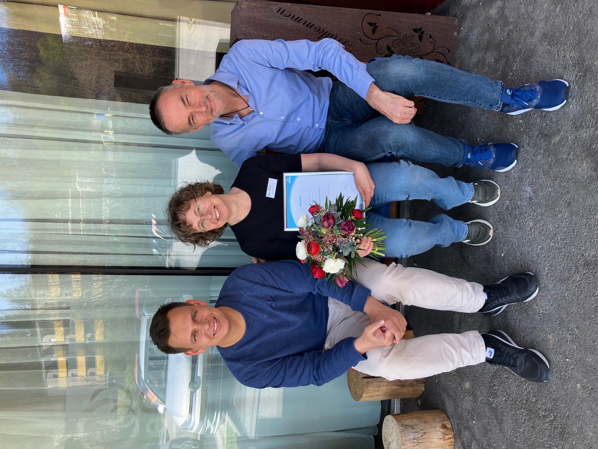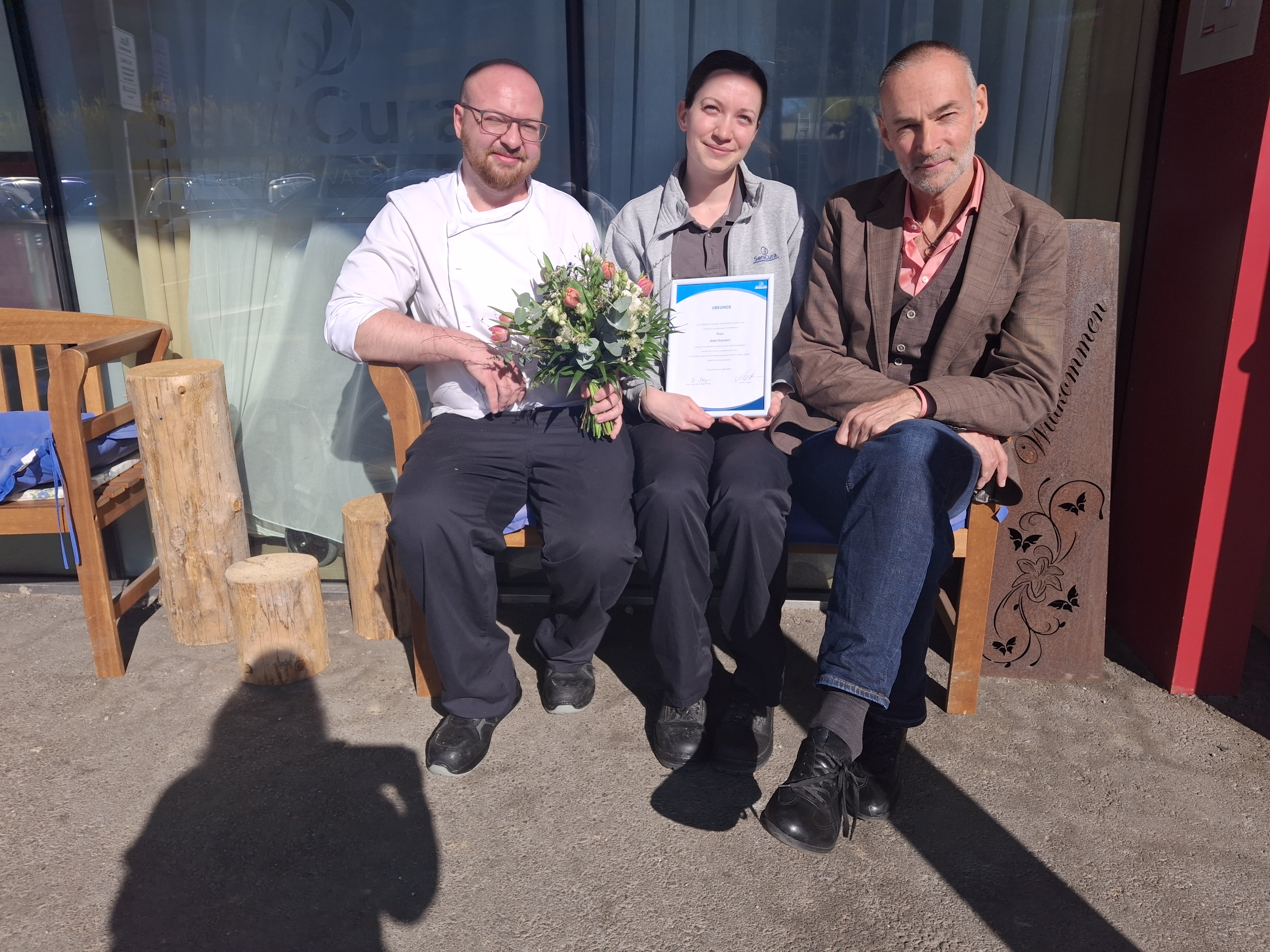 Küchenleiter Kevin Maier und Hausleitung Mag. Hermann Major gratulieren Küchenhelferin Adel Kovacs