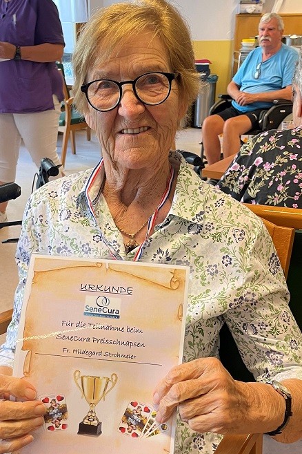 Nach spannenden Spielrunden und einigen echten Nervenkitzelmomenten standen am späten Nachmittag die Sieger fest: Der erste Platz ging an Bewohner Severin Galler aus dem SeneCura Sozialzentrum St. Veit in der Südsteiermark, der damit auch den begehrten Wanderpokal mit nach Hause nehmen durfte. Den zweiten Platz belegte Bewohner Josef Weber aus dem Gastgeberhaus Feldbach, während sich Bewohnerin Gertraude Cigler aus Stainz über den dritten Platz freuen durfte. Neben Medaillen und einer persönlichen Urkunde erhielt das Siegertrio liebevoll zusammengestellte Geschenkpakete mit regionalen Köstlichkeiten und kleinen Überraschungen. „Das war ein richtig spannender Tag – ich spiele leidenschaftlich gerne Schnapsen, und heute war wirklich alles dabei: gute Karten, starke Gegner und viel Spaß. Ich freu mich riesig über meinen Pokal!“, sagte Josef Weber, Zweitplatzierter und Bewohner des SeneCura Sozialzentrums Feldbach, sichtlich stolz. Doch auch alle anderen Teilnehmenden gingen nicht leer aus – der Tag bot zahlreiche Erfolgserlebnisse, gute Gespräche und beste Unterhaltung.